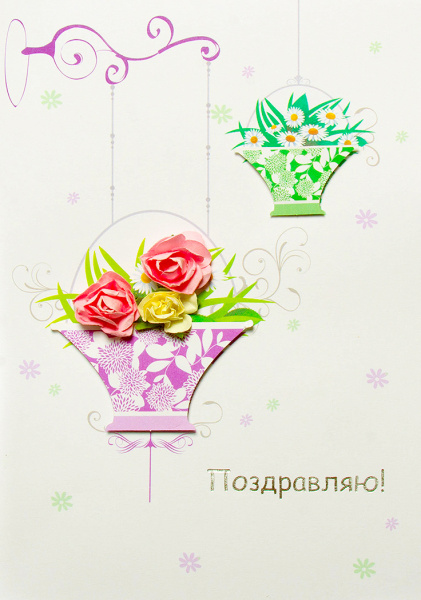 ---Открытка ручной работы 3D, Поздравляю! (цветочные кашпо), 1 шт.