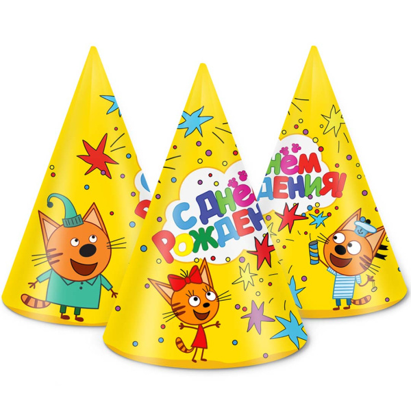 Колпаки, Три Кота, С Днем Рождения! Желтый, 6 шт. в уп.